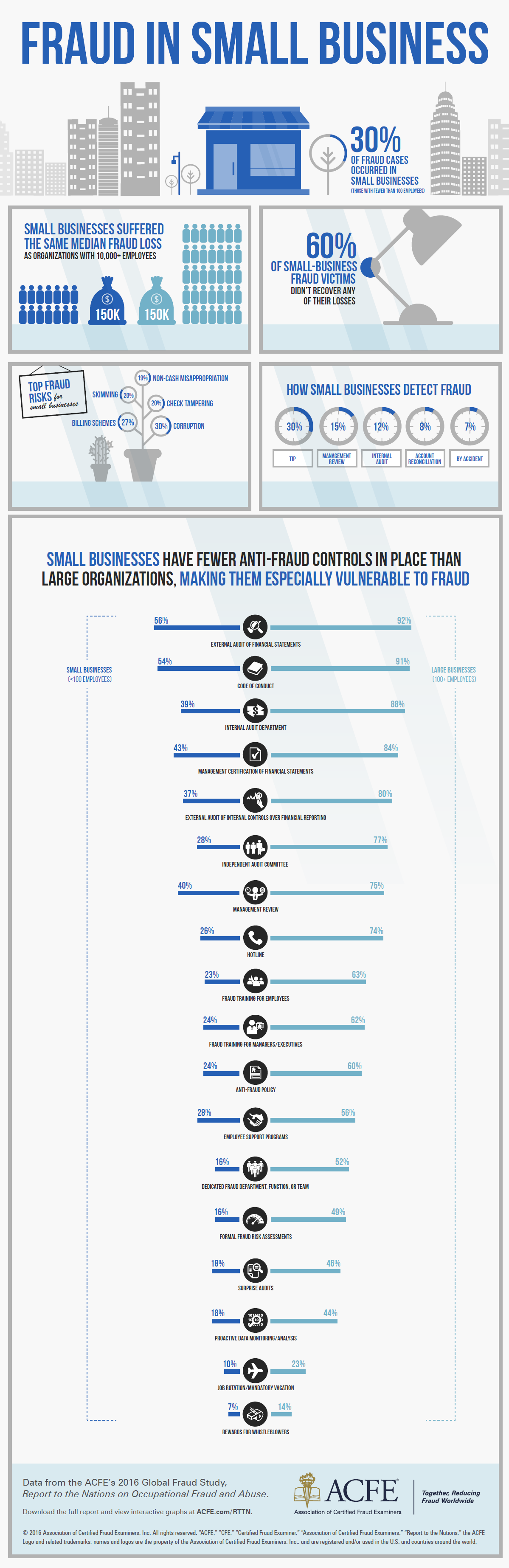 It is impossible to know exactly how much fraud goes undetected or unreported, and even calculations based solely on known fraud cases are likely to be underestimated, as many victims downplay or miscalculate the amount of damage. Nonetheless, attempts to determine the cost of fraud are important, because understanding the size of the problem helps bring attention to its impact, enables organizations to quantify their fraud risk, and helps management make educated decisions about investing in anti-fraud resources and programs. (Click on the info-graphic below to download)